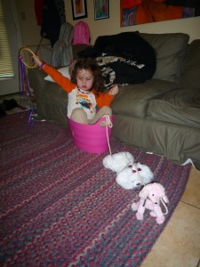 Not able to fulfill her canine dreams, Lily turns to the next best thing: her little sister. It is not unusual to hear her say, “This is Vivienne. She’s our dog.” Much to Lily’s dismay, Vivienne is not a very good pet. Maybe when she gets a little older she will also delight in being strapped into a leash, playing fetch with a rubber ball and taking walks around the living room.