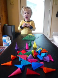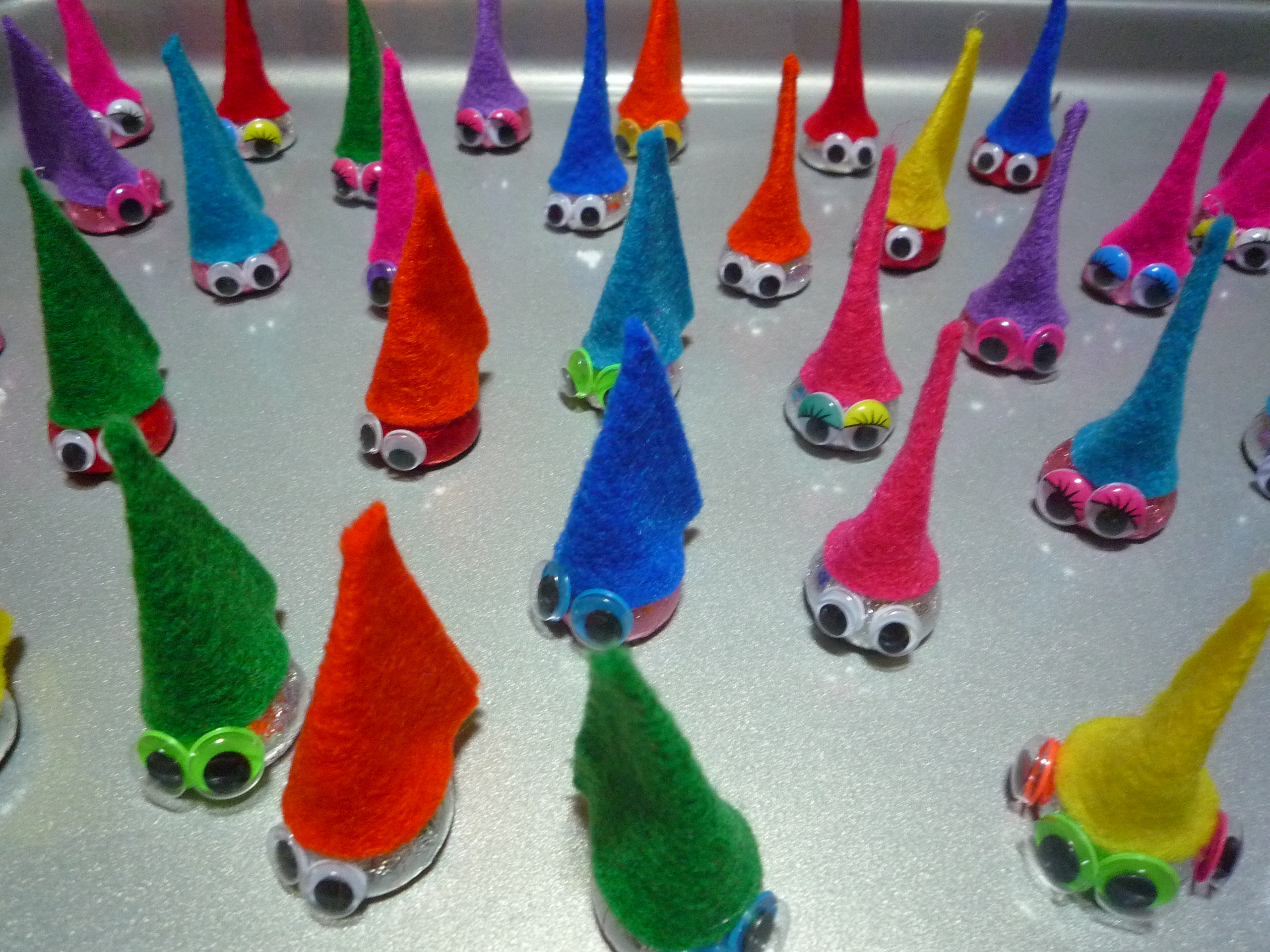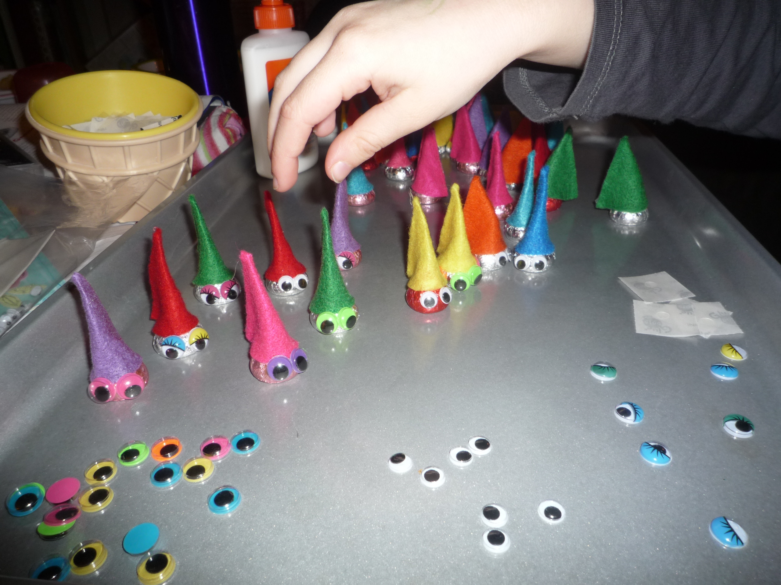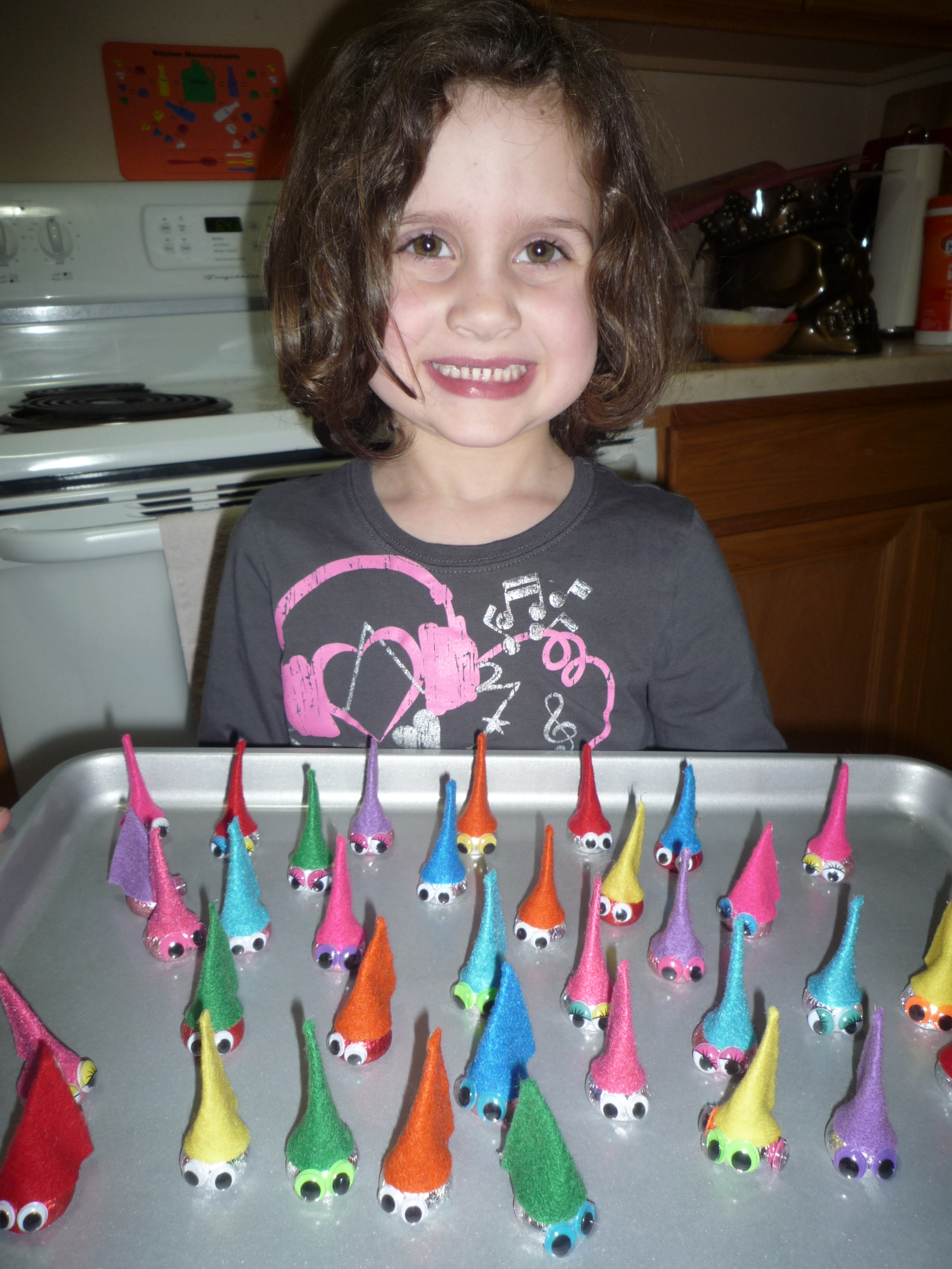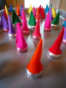 Project Valentine 2011: Hersey’s Kiss Gnomes. (This will be so easy and cute!) And again, Lily sits at the table, watching me cut circles of out felt. She tries unsuccessfully to cut circles out of her piece of felt, gets frustrated and decides to play outside with her friends instead. I cut, glue, assemble.